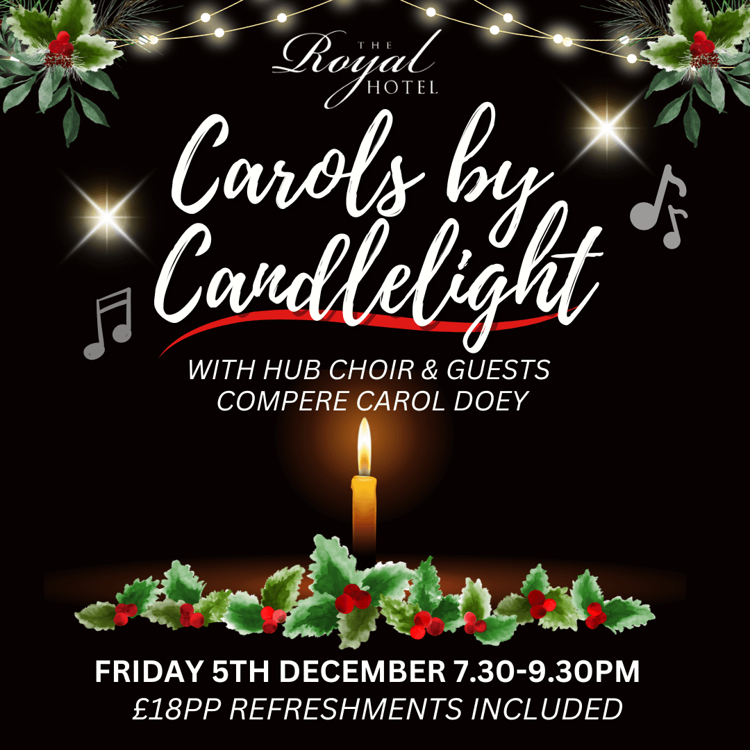 🎶 Carols by Candlelight at The Royal Hotel Join us for a magical evening of music and festive spirit at Carols by Candlelight, featuring performances from the HUB Choir & Guests, with compere Carol Doey.