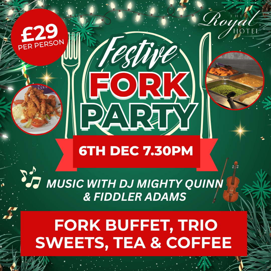 🎉 Festive Fork Party at The Royal Hotel Get into the Christmas spirit with our lively Festive Fork Party on Friday 6th December at 7:30PM – the perfect night of food, fun, and festive cheer!