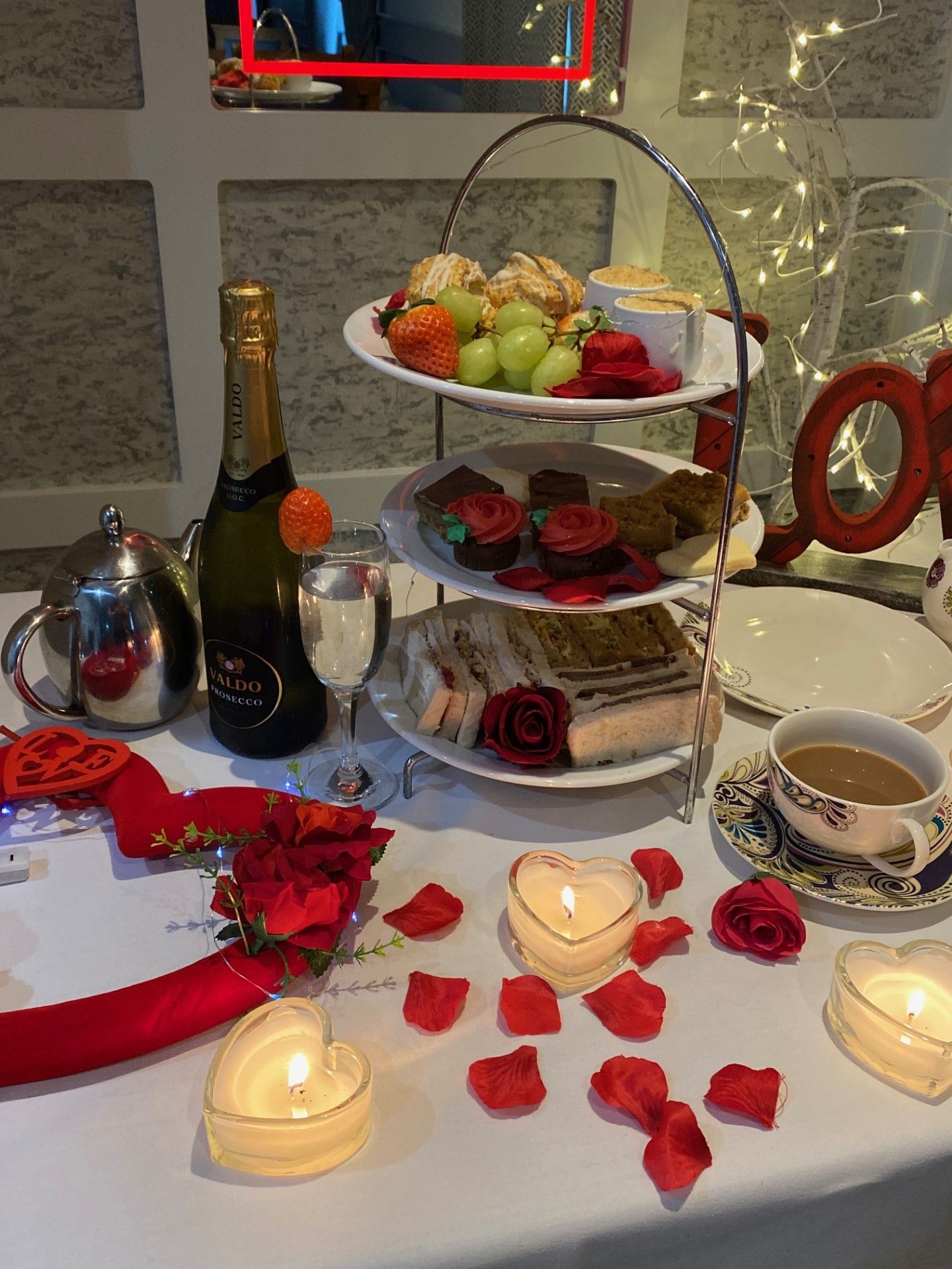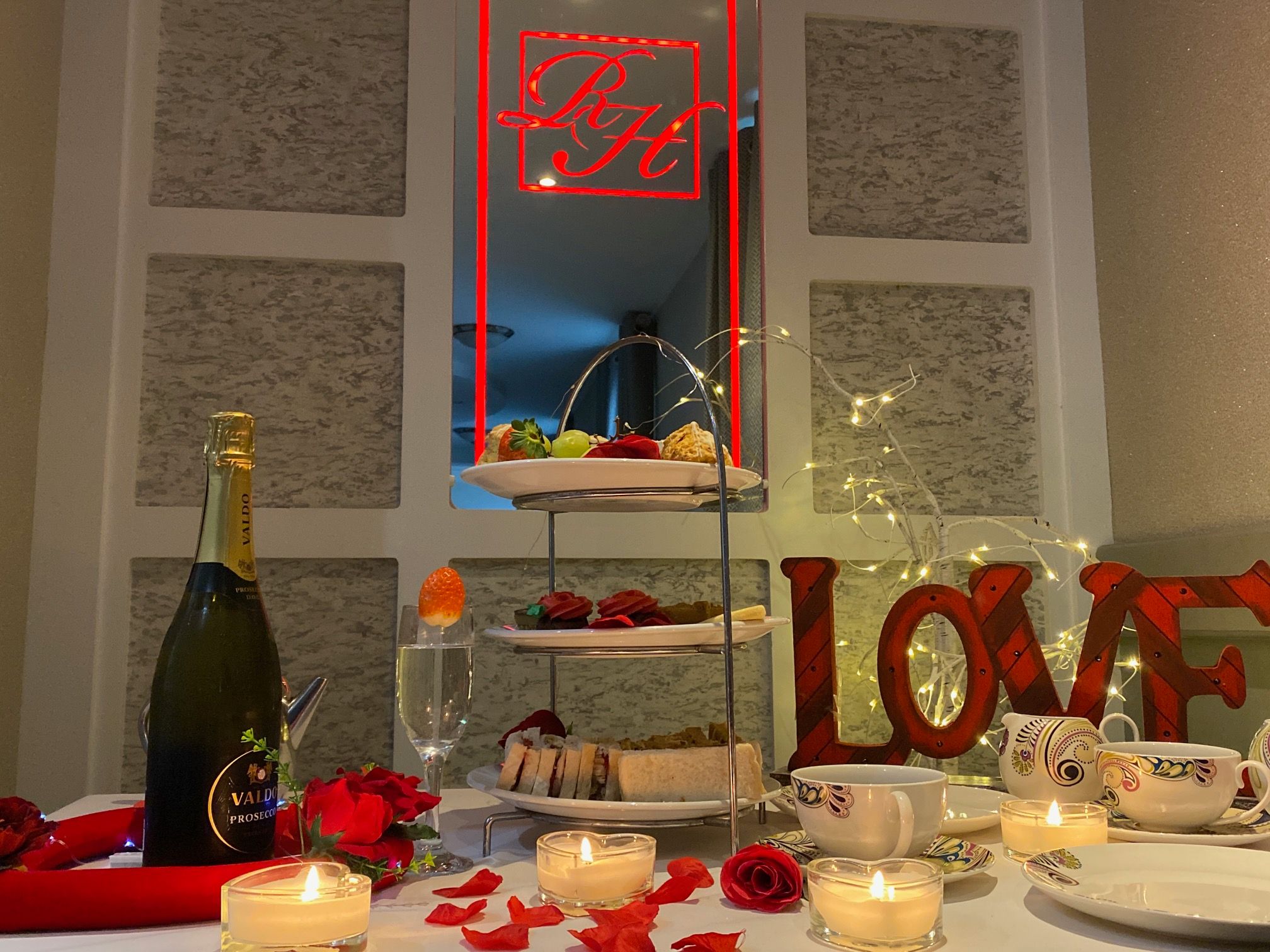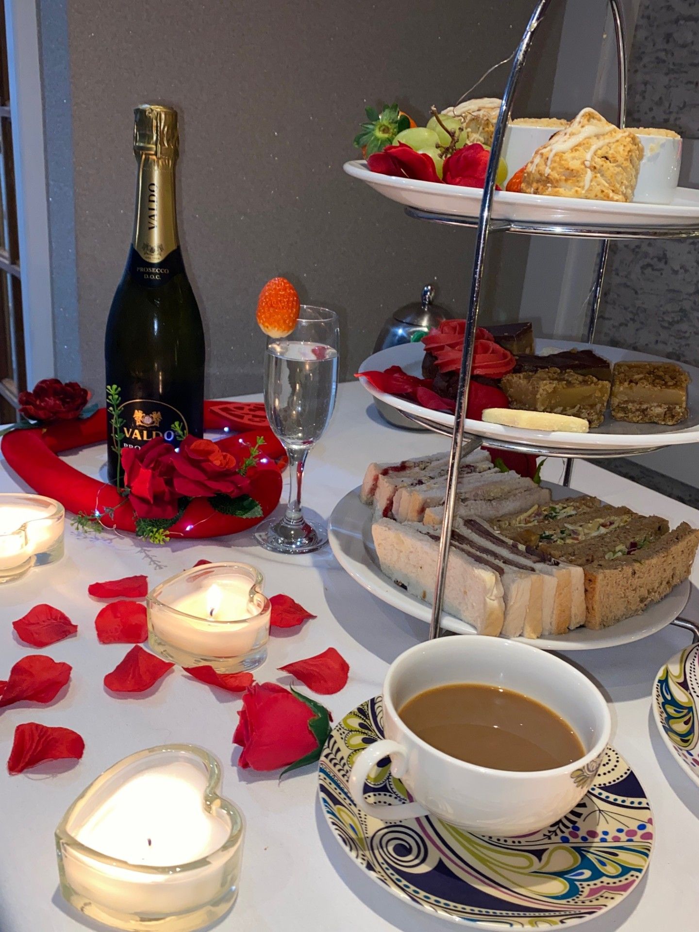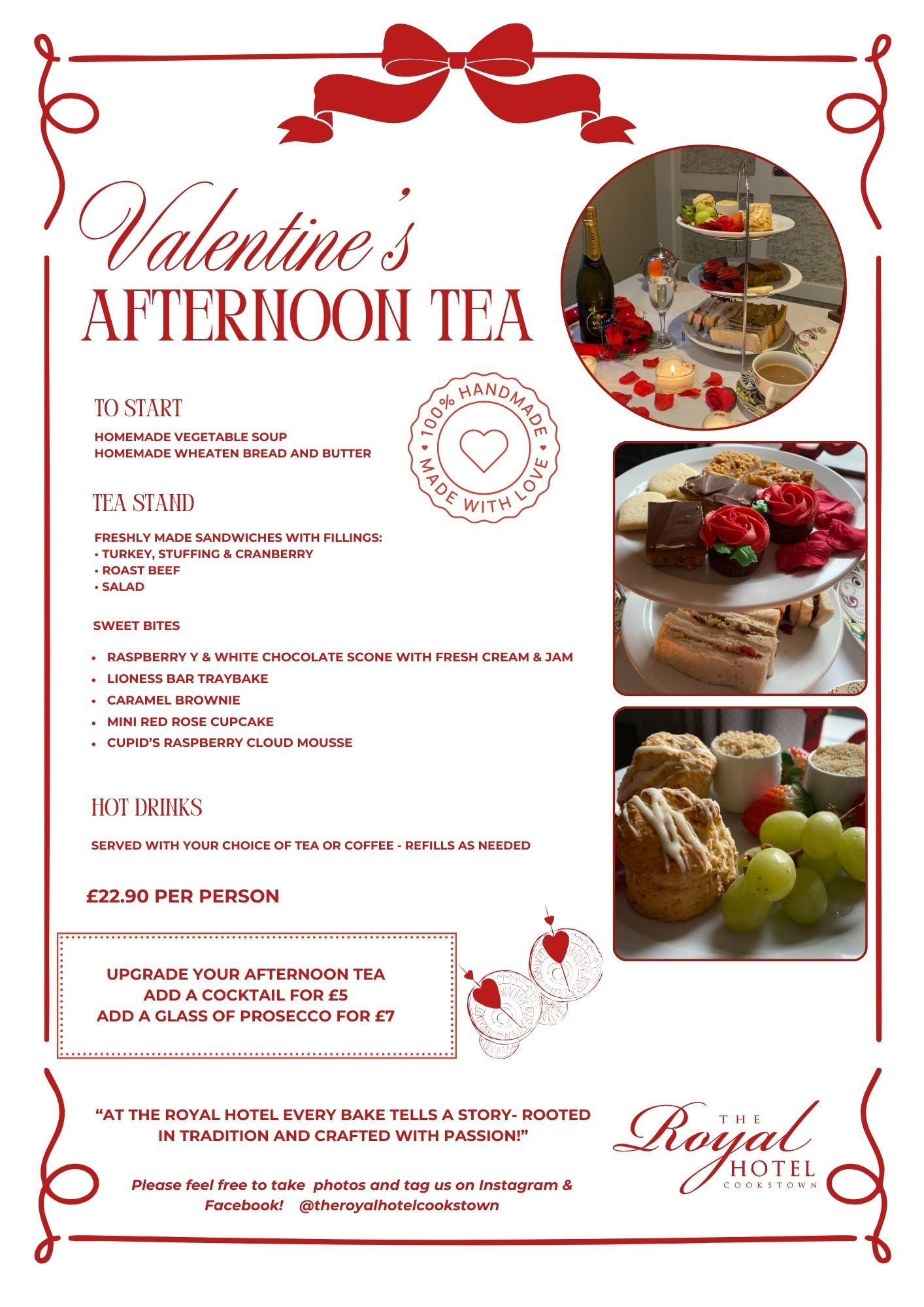 Indulge in our all-new Homemade Valentine's Afternoon Tea experience. Begin with homemade vegetable soup and wheaten bread, followed by freshly baked scones with generous servings of our raspberry conserve and fresh cream. Enjoy delicate filled finger sandwiches, homemade traybakes, and mini desserts, accompanied by tea or coffee.