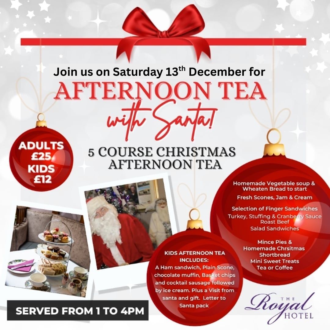 Afternoon Tea with Santa – Saturday 13th December Celebrate the magic of Christmas at The Royal Hotel with our festive 5-Course Afternoon Tea. Enjoy a delicious menu featuring homemade vegetable soup, fresh scones, a selection of finger sandwiches, mince pies, Christmas shortbread, and more – served with tea or coffee.