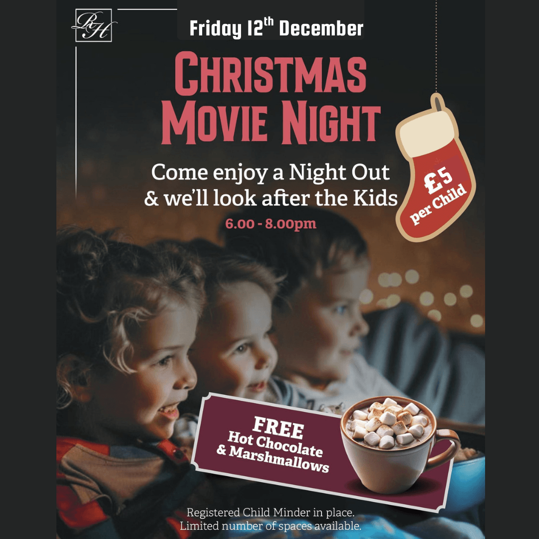 Parents — enjoy a well-deserved night out while we look after the kids with a cosy festive movie, sweet treats, and a magical atmosphere and a special 2 Course menu available for the parents in Squires Lounge!