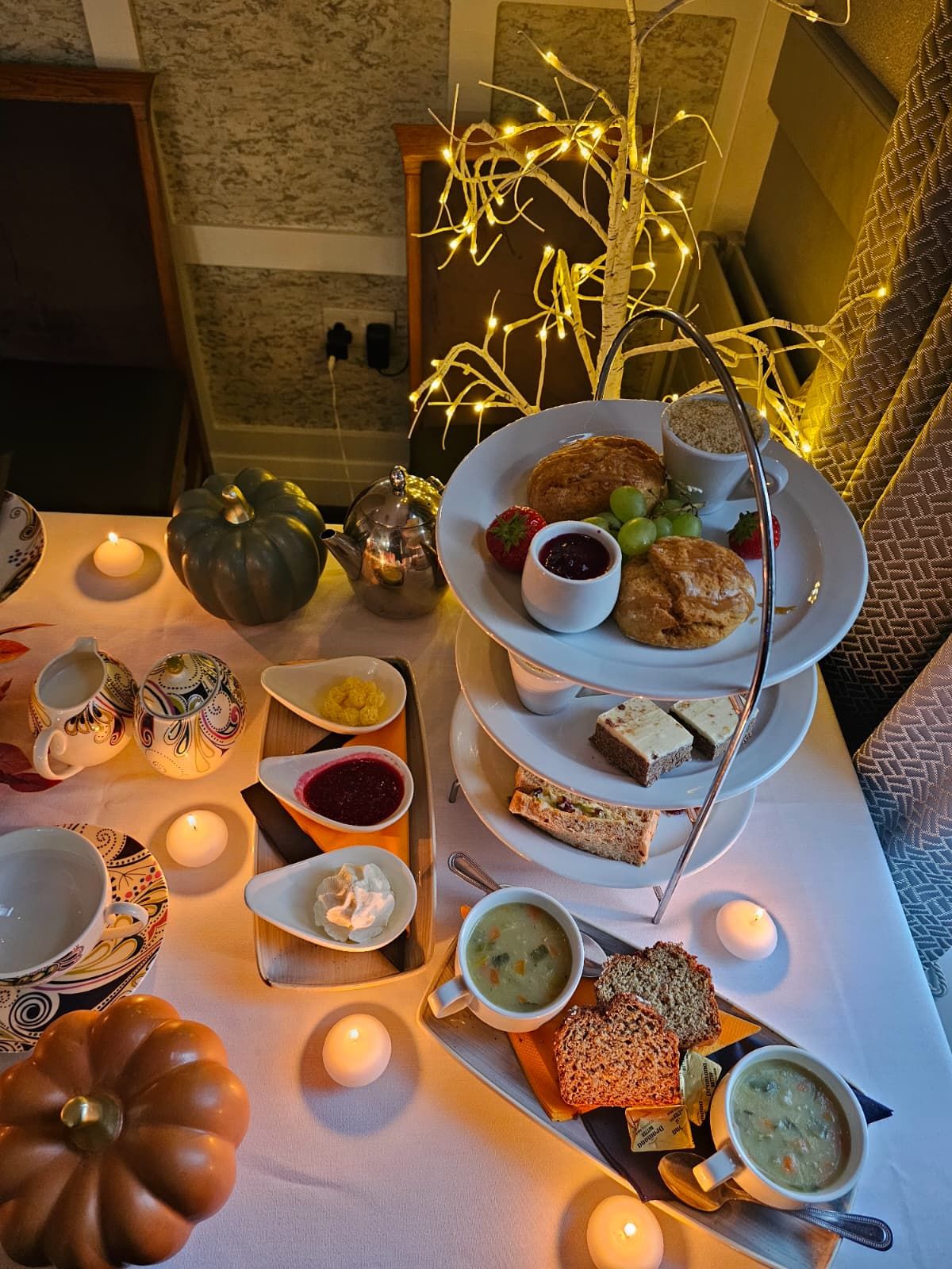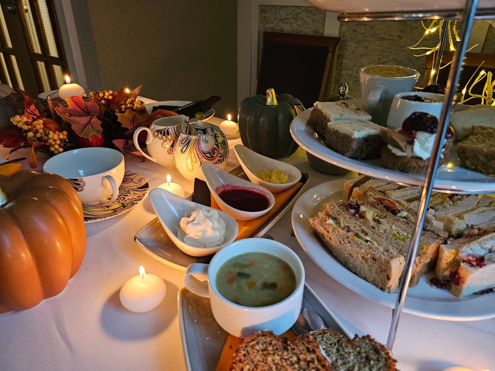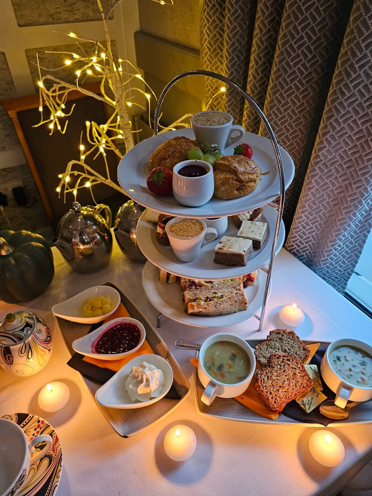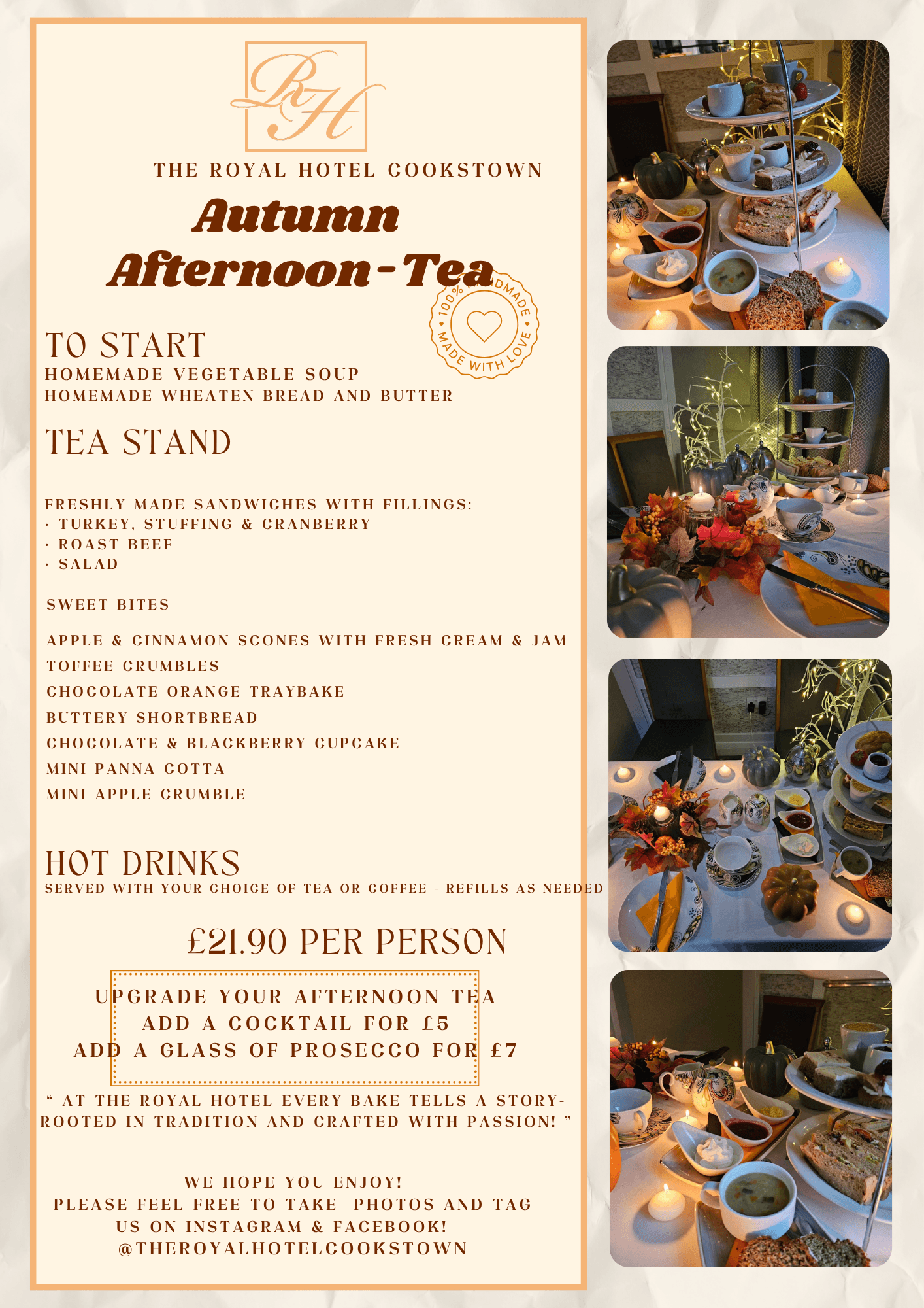 Indulge in our all-new Homemade Autumn Afternoon Tea experience. Begin with homemade vegetable soup and wheaten bread, followed by freshly baked scones with generous servings of our raspberry conserve and fresh cream. Enjoy delicate filled finger sandwiches, homemade traybakes, and mini desserts, accompanied by tea or coffee.