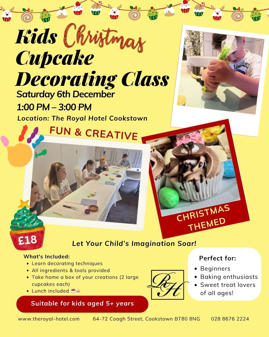Bring the Christmas magic to life at The Royal Hotel, Cookstown with a fun-filled cupcake decorating workshop for kids! Taking place on Saturday 6th December 2025, this creative session is perfect for little bakers aged 5 and over.