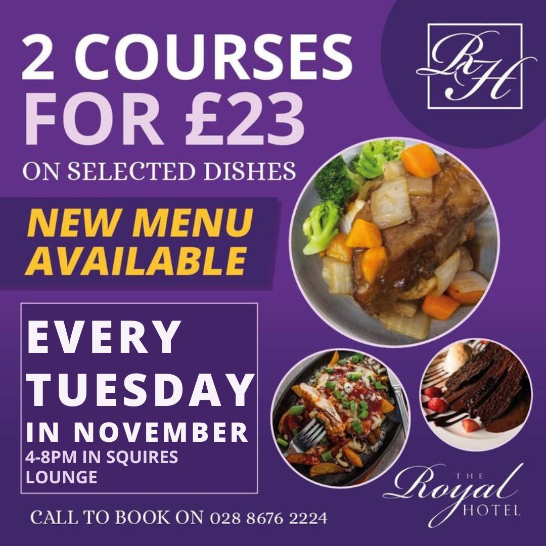 Every Tuesday in November, enjoy 2 courses for £23. Available in the lounge, 4 pm - 8 pm.