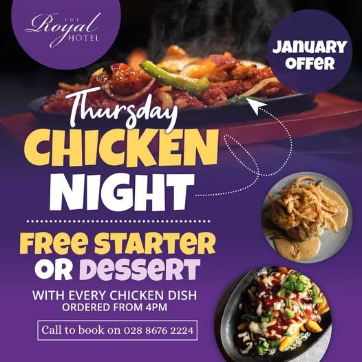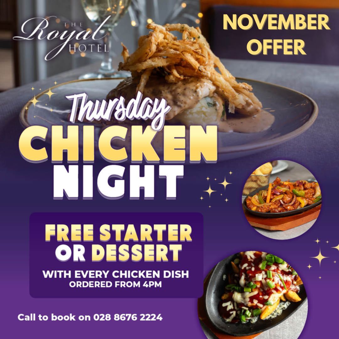 Thursday Night is Chicken Night. Grab a free starter or dessert with every chicken dish ordered from 4 pm.