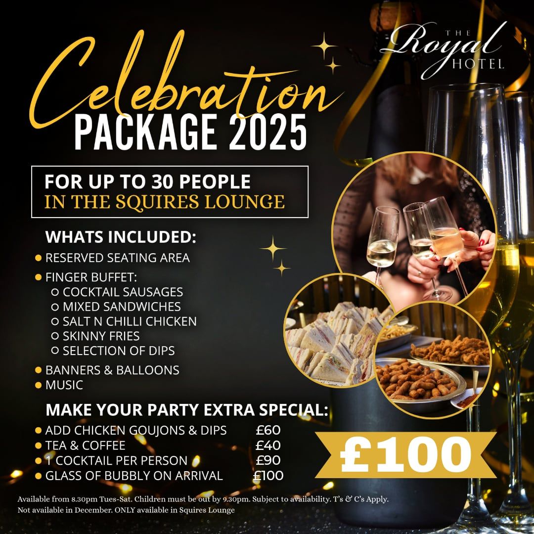Celebrate in Style at The Royal Hotel Planning a night out with friends, family, or colleagues? Our Celebration Package 2025 is perfect for groups of up to 30 people in the stylish Squires Lounge.